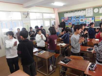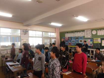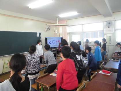 今日は、6年生の英語学習の様子を勝山中学校の英語の先生とC−NETのマーク先生に参観していただきました。