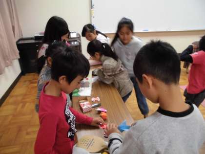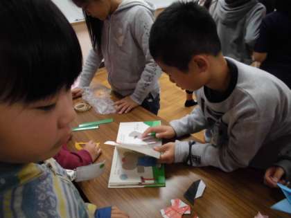 いろいろなことにチャレンジしている話やこんなこともふつうにできますという話を聴いた後、子どもたちは山本さんが使っている道具や作った物を実際に手を取ったりしています。