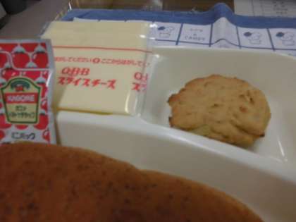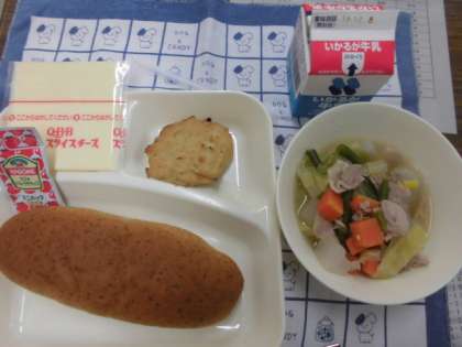 献立は、とうふハンバーグ、スープ煮、ケチャップ、パン、牛乳でした。