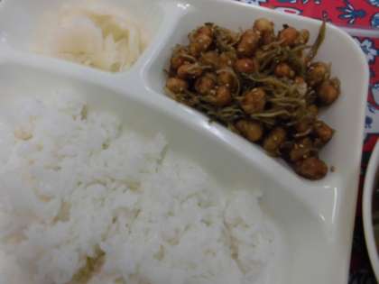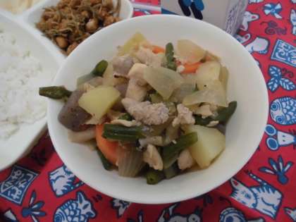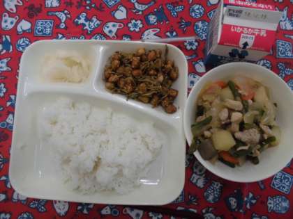 献立は、鶏肉と野菜の煮物、じゃこ豆、かぶのゆず風味、ごはん、牛乳でした。