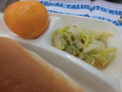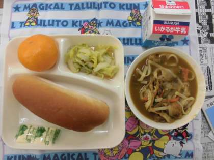 献立は、カレーうどん、はくさいのおひたし、みかん、パン、マーガリン、牛乳でした。