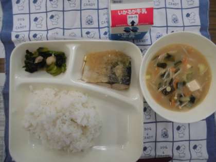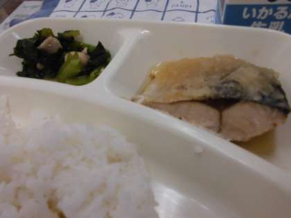 献立は、さばのみぞれかけ、みそ汁、こまつなの煮びたし、ごはん、牛乳でした。