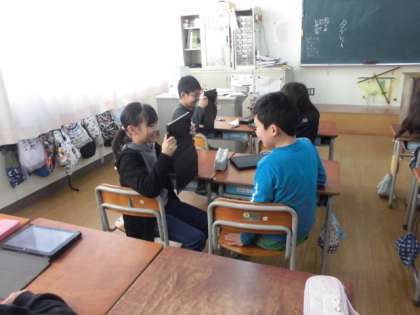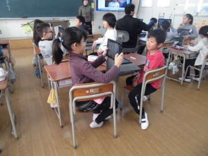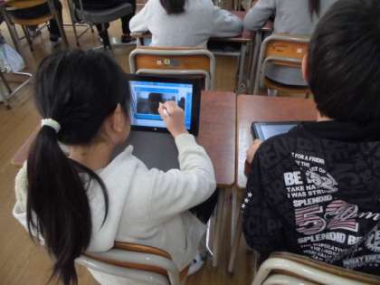 3年2組では、タブレット端末を使っての学習をしていました。