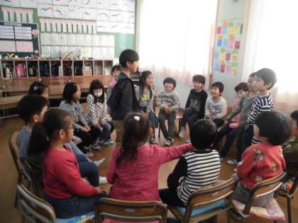 1年生は、教室でゲームをした後、講堂でもハンカチ落としなどのゲームをして楽しんでいました。