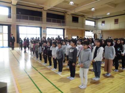 続いて、生活指導担当からは「三つの車」(赤い車−消防車、白い車−救急車、白と黒の車−パトカー)ということで、火の用心、健康面、安全面についての話がありました。