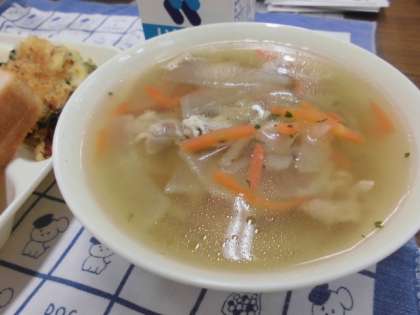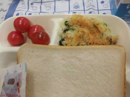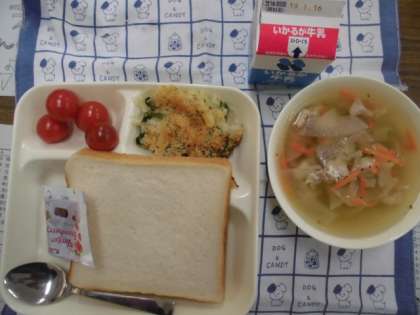 献立は、ほたて貝のグラタン、だいこんのスープ、プチトマト、パン、ジャム、牛乳でした。