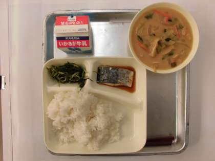 献立は、さごしのしょうゆだれかけ、みそ汁、みずなの煮びたし、ごはん、牛乳でした。