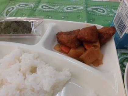 献立は、酢豚、ワンタンの皮のスープ、焼き海苔、ごはん、牛乳でした。