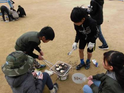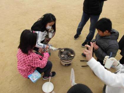 これは、毎年の3年生が行っている七輪を使っての火起こしともち焼きです。