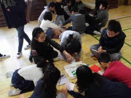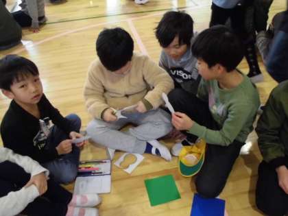 今朝は、掲示委員会による2月の玄関掲示に使う「雪だるま」を各縦割り班ごとに作成する活動をしました。