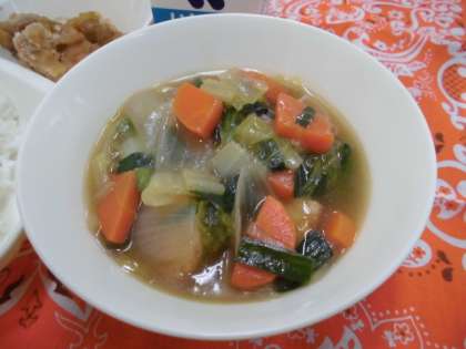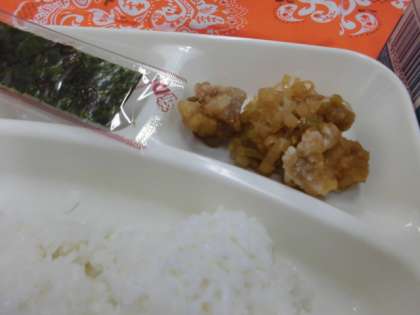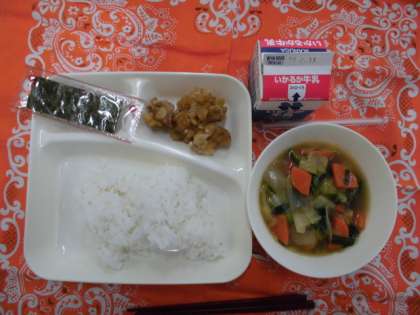 献立は、あげ鶏のねぎソースかけ、あつあげとはくさいの中華煮、焼き海苔、ごはん、牛乳でした。