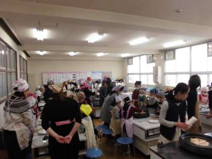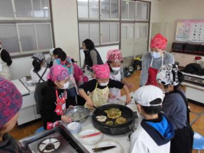 保護者の方や教職員も入って、楽しく真剣に調理をしています。