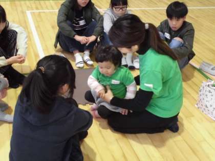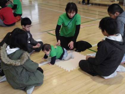 児童は、それぞれのグループのお母さんから、出産のときの話やその後の育児についての話などを聴きながら、赤ちゃんにふれたりしていました。