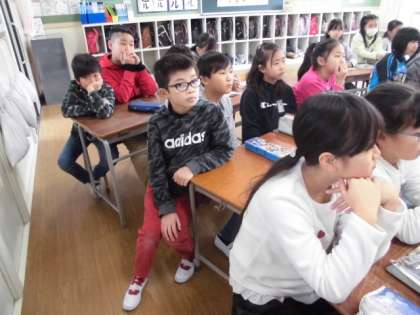 読書タイムの時間に3年生が昌山図書館補助員からの読み聞かせをしていただいていました。