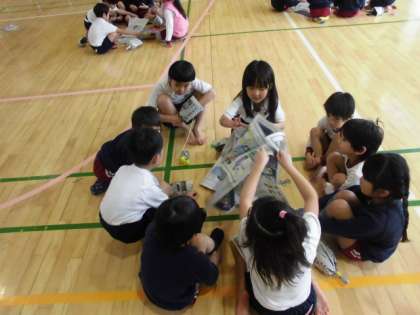 リズム交流が終わり休み時間をはさんで、今度は新聞紙を使って「手作りけん玉」を1年生の子どもたちが、園の子どもたちに教えながら一緒に作っていました。
