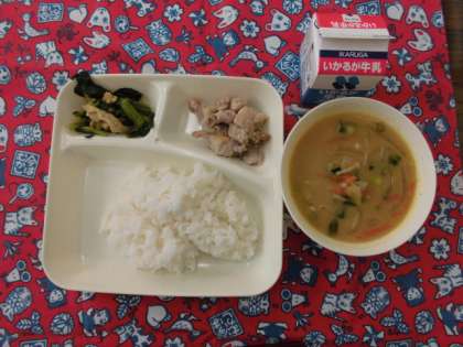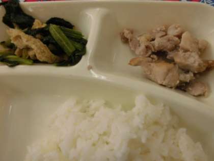 献立は、鶏肉のゆず塩焼き、みそ汁、こまつなの煮びたし、ごはん、牛乳でした。