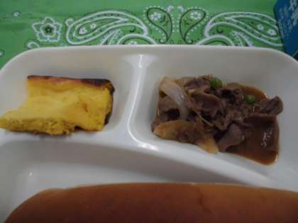 献立は、牛肉のデミグラスソース煮、コーンスープ、かぼちゃのプリン、パン、牛乳でした。