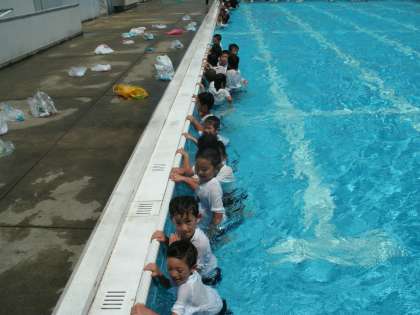 1年生と一緒に水の中で服を着たままの感じを体験しました。