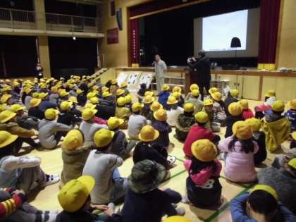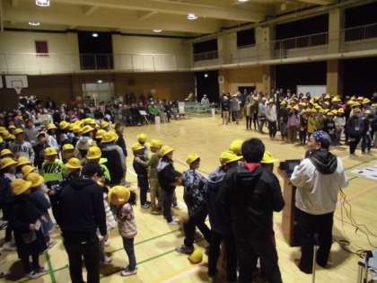 避難訓練後は、講堂で地域合同防災プログラムを体験します。