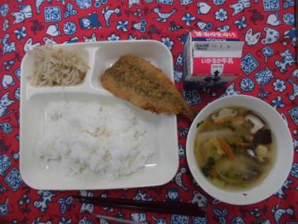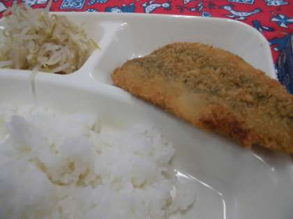 献立は、いわしのフライ、五目汁、もやしのしょうゆがけ、ごはん、牛乳でした。