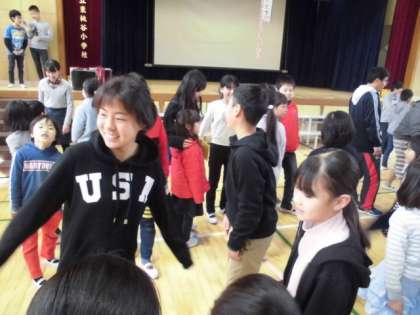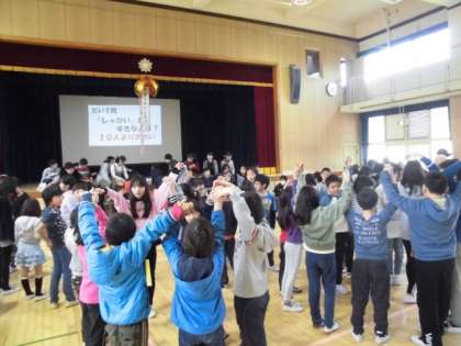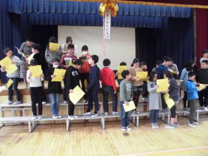 クイズの後は、6年生も一緒にいつもの縦割り班に入ってのダンスポーズを使ったジャンケンゲームをしたり、在校児童からの色紙プレゼントや6年生からのお礼のぞうきんをプレゼントしたりの交流がありました。