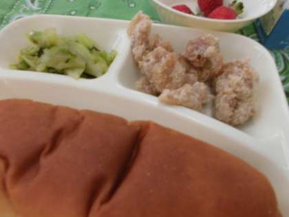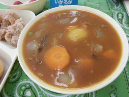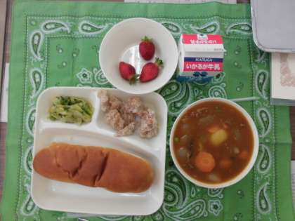 いつもより一品多く、フライドチキン、カレーシチュー、春のカラフルソテー、いちご、パン、牛乳でした。
