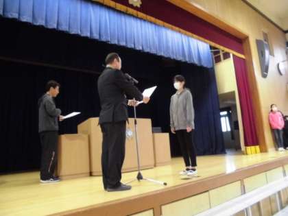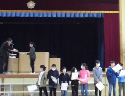 児童朝会では、校長の東日本大震災に関わる話の後、多くの児童に書初め展、書道展、幼小美術展などの賞状を授与しました。