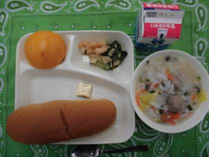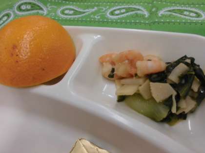献立は、えびとチンゲンサイの炒め物、中華がゆ、はっさく、パン、バター、牛乳でした。
