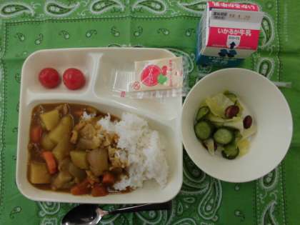 献立は、チキンカレーライス、金時豆と野菜のサラダ、プチトマト、牛乳でした。