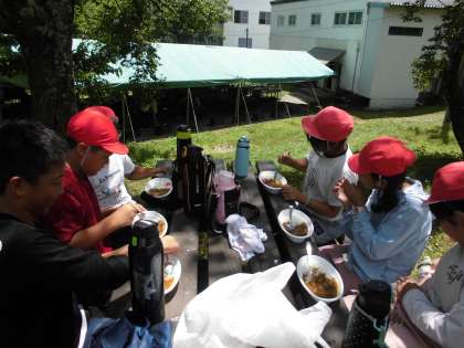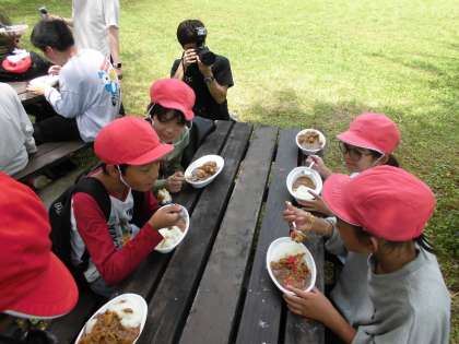 みんなで協力しておいしいカレーの完成です。ごはんもおいしく炊けました。いただきます。