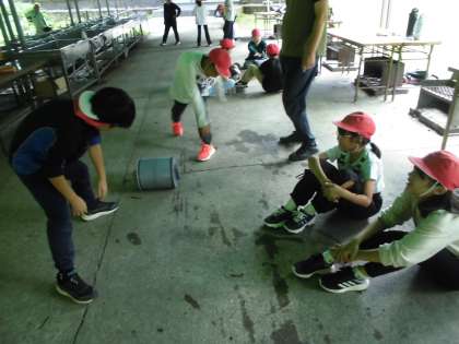 アイスの具材を容器に入れ、さらに、氷と塩を入れた特殊な塩ビ管に、その容器を入れて蓋をします。それを30分間転がして、アイスにします。