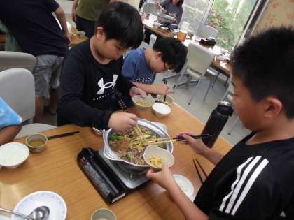 林間二日目は、思いっきり活動し、充実した一日になりました。疲れた体にエネルギーチャージです。今日の晩御飯は、「すき焼き」です。美味しくいただきます。
