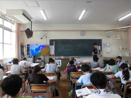 夏休み中も、全国各地で大雨などによる災害が起きました。大阪府下においても急な雷雨などめずらしくはありません。今日の社会の学習は、「大阪府の風水害」というテーマで、私たちが住んでいる大阪のことについても話題にしながら、学習を進めました。