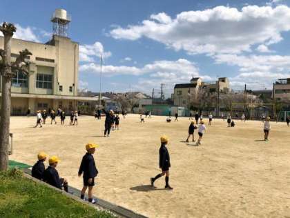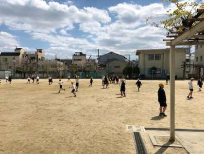 15日の昼休みは、とても暖かくて気持ちの良い春の気候でした。子どもたちはいっせいに運動場に出て、担任の先生と一緒に遊ぶ姿が見られました。