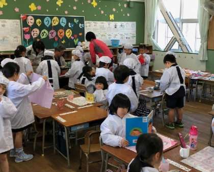 今は、サポートの先生方が何人か入っていますが、そのうちに、一年生のみんなだけで給食の準備をすることになります。