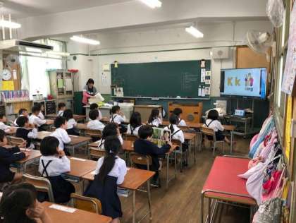 大阪市独自の取り組みで、低学年でも英語の映像を見ながら発音したり、歌ったりしています。