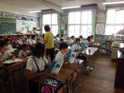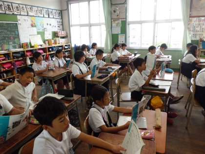 教室で音楽の授業です。音楽に合わせながら頭声的発声で斉唱しています。