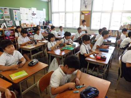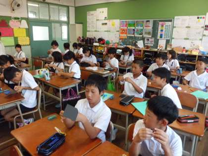 9月9日(火)4年生がアイマスク体験をしました。教室で黒い色画用紙を切ってアイマスクを作成。二人一組になって傘を杖がわりに、2階の教室から1階へ、さらに教室にもどります。見えない状況でなかなかうまく歩けませんでした。学習を通して、様々なことを学んでいくと思います。