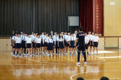 はじめに6年生の模範歌唱があり、福田先生の指導と富先生の指揮で全員で合唱しました。