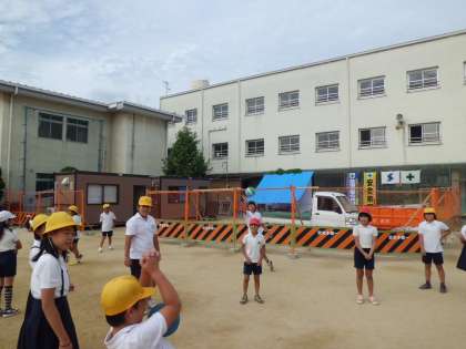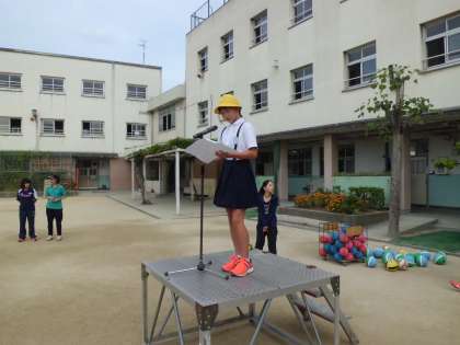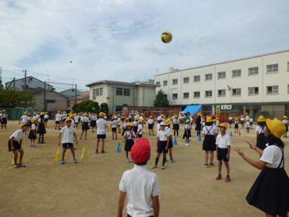 9月18日(木)の朝、児童集会でバレーボール送りをしました。集会委員会の児童の説明の後、縦割り班に分かれて、ボールをまわしました。上にあげてのボール送りなので低学年の子どもたちはむずかしそうでした。みんな楽しそうにゲームをしていました。