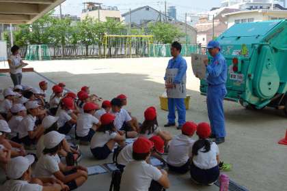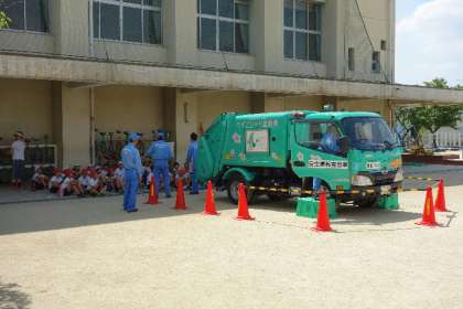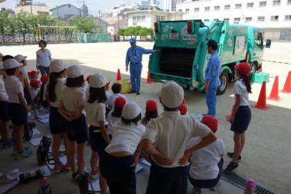 ごみやリサイクルについて、環境局の方からいろいろと教えていただきました。パッカー車の実演もありました。