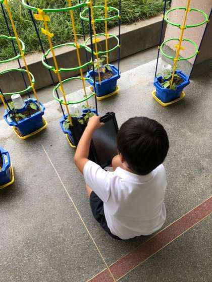 6月18日、5時間目、一年生はアサガオの観察を行いました。