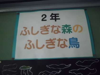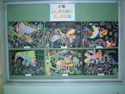 正門玄関を入ったところ右手に掲示板があります。左の掲示板には現在は2年生の作品が展示されています。作品名は「ふしぎな森のふしぎな鳥」です。掲示物がかわればまたアップします。学校に来られた時にごらんください。