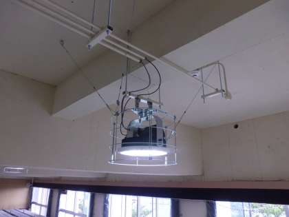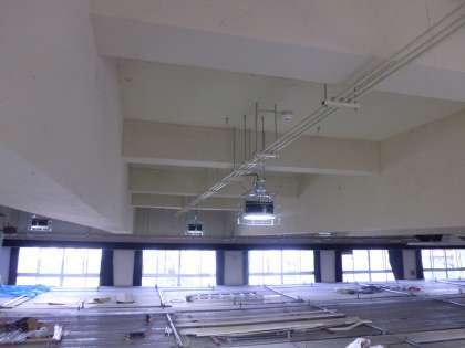 講堂の改修工事が、順調に進んでいます。天井の電気設備の設置・配線もほぼ完了し、天井面の塗装に入っています。10月下旬には、使用可能になる予定です。