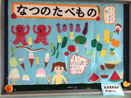 正門入って右手の掲示板に、給食委員会が作った「なつのたべもの」が掲示されています。とても上手に、楽しく作ってくれました。