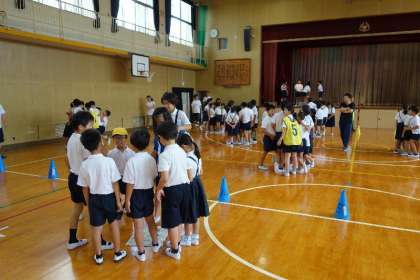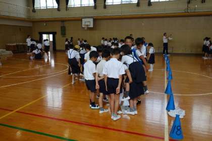 それがクリアできたら、さらにその半分ということになるのですが、約10名の児童が非常に小さな新聞紙に乗るのは至難の業。みんな工夫をして、低学年の児童をおんぶするなど果敢に挑戦して、楽しいひと時を過ごしました。