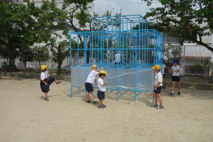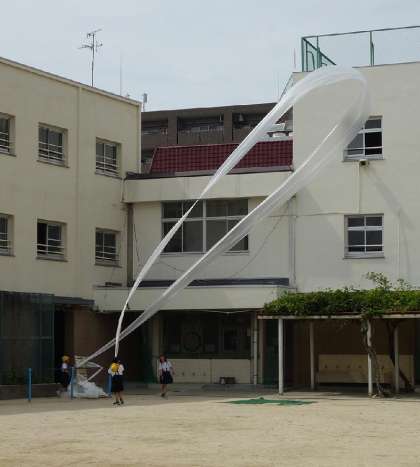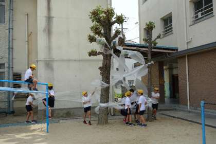 4年生の巨大な作品づくりは、少し風のある中でみんな大騒ぎで、テープとって!、はさみとって!、こっちくくって! と見事に分業しながら作品を作っていました。