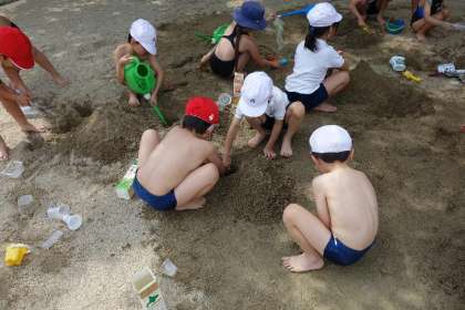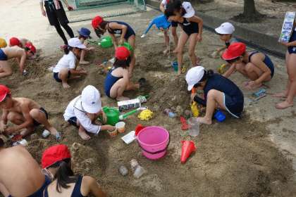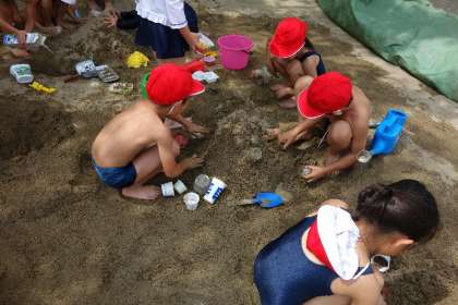みんなとっても楽しそうに、砂を掘り、水を汲んできてはかけたり、流したりしながら山や池をつくり、トンネルを掘り、お友達と協力しながらいろいろな地形をつくっていました。