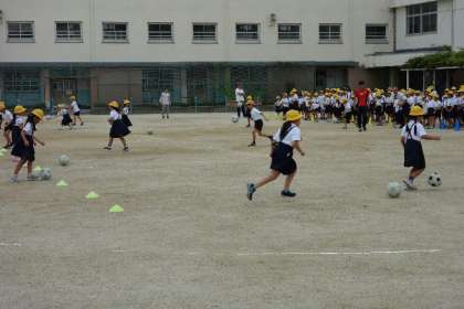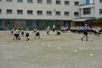 縦割り班で分かれて、前半は手でボールをドリブルして、コーンのところで、くるりとまわって、帰りは足でボールをドリブルしていく。それをリレーしていきます。