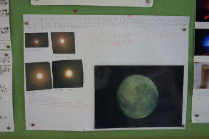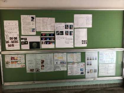 1階廊下の掲示板(玄関入って左手、階段の向かい)に4年生の自由研究が掲示されています。